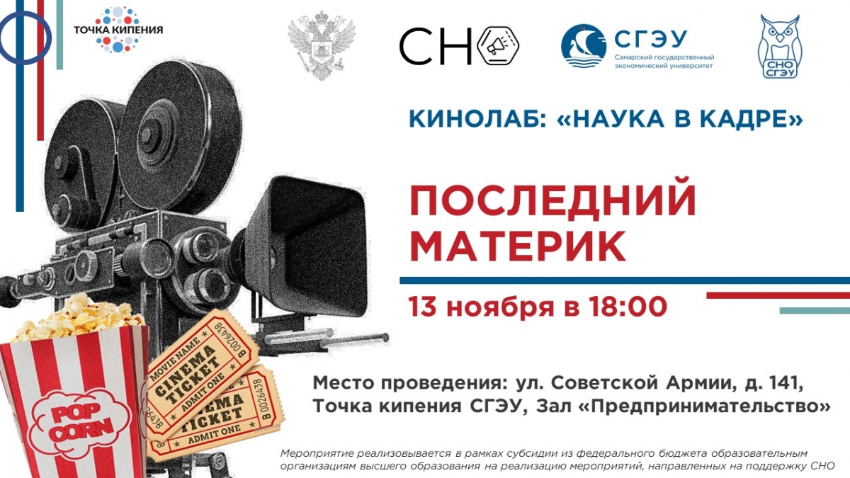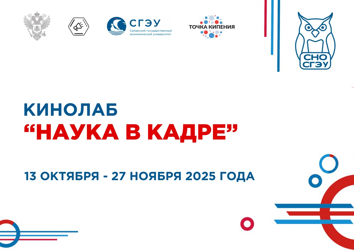 Кинолаб "Наука в кадре" – это наш новый авторский формат, реализуемый совместно с Точкой кипения СГЭУ, который пройдёт с 13 октября по 27 ноября 2025 года.